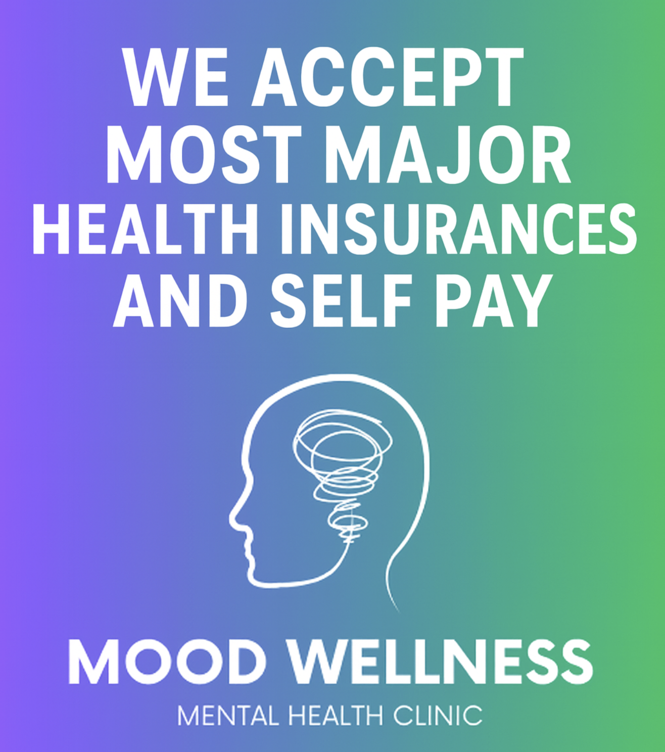 Mood Wellness takes most commercial insurances and self-pay. We are in the process of credentialing with more major insurance plans- please continue to visit our website for updates.